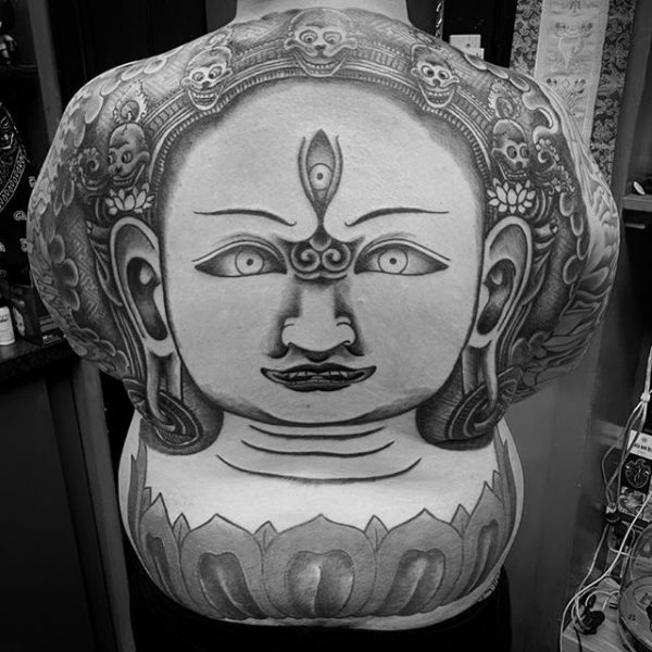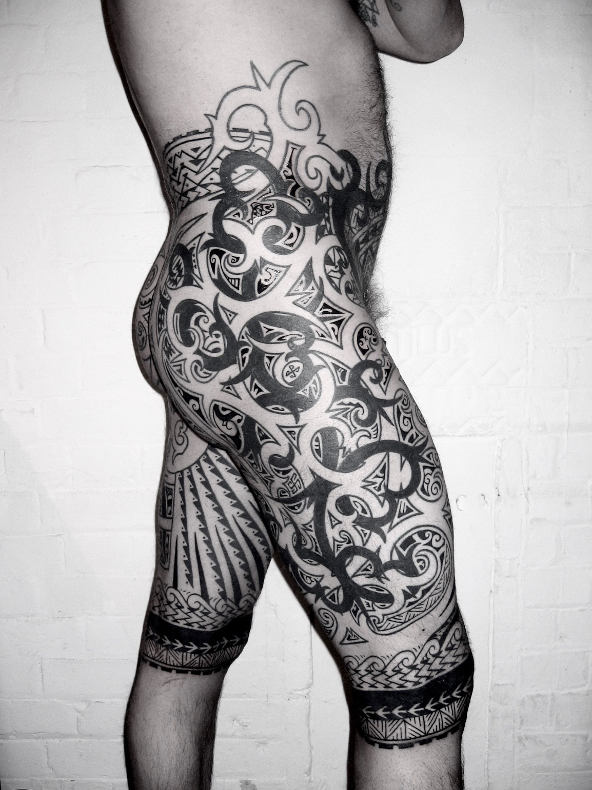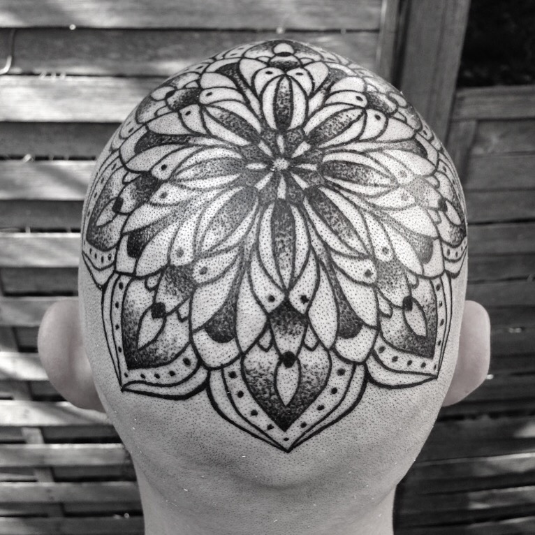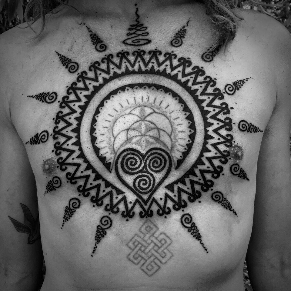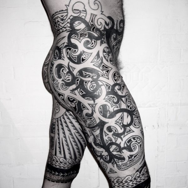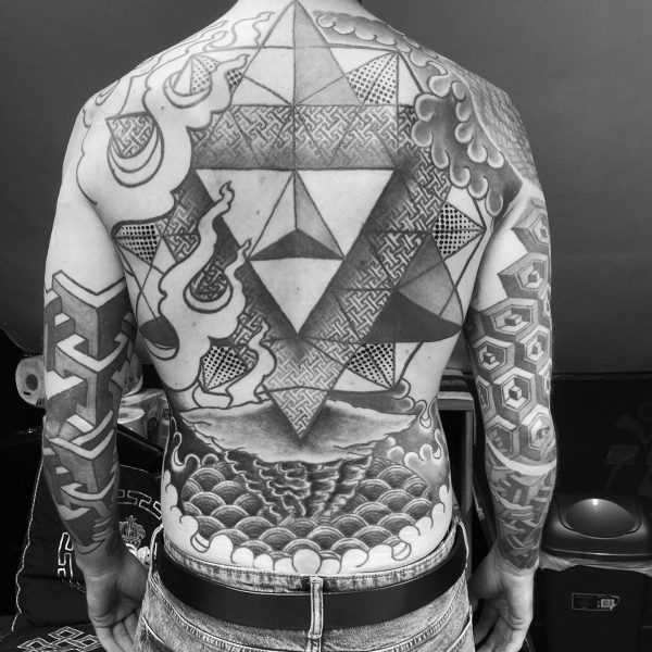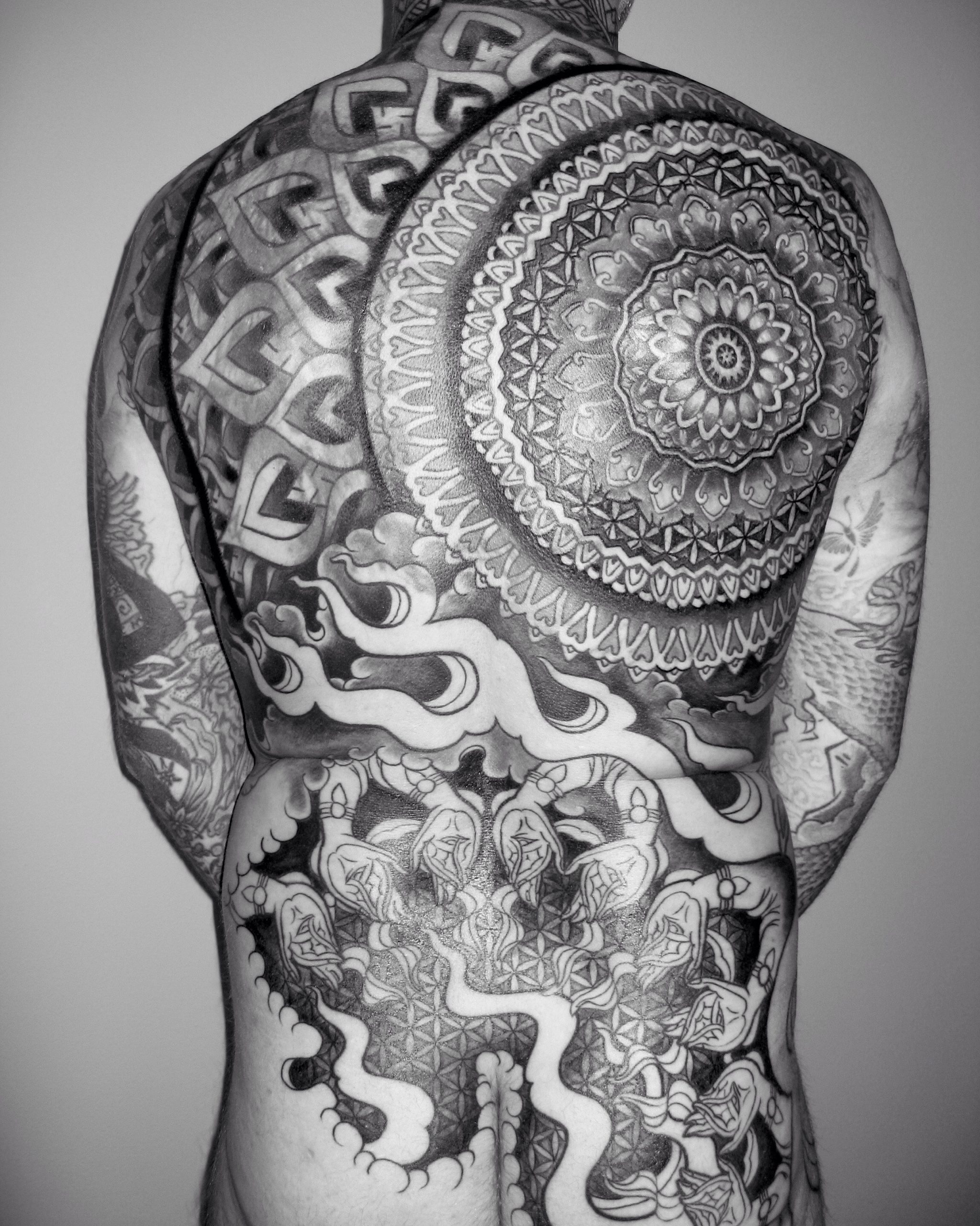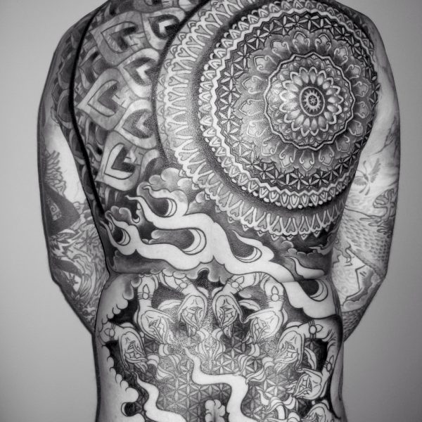Jim’s work is deeply influenced by Zen and Tibetan Buddhist practices, reflecting a disciplined and meditative approach to both his tattooing and painting. His tattoo style is characterized by bold geometry, mandala-like patterns, and compositions that flow harmoniously with the body’s contours. Under his creative alias Zen Not Zen, Jim continues to produce limited artworks, bespoke tattoo machines, and other objects, all embodying his commitment to mindful craftsmanship.